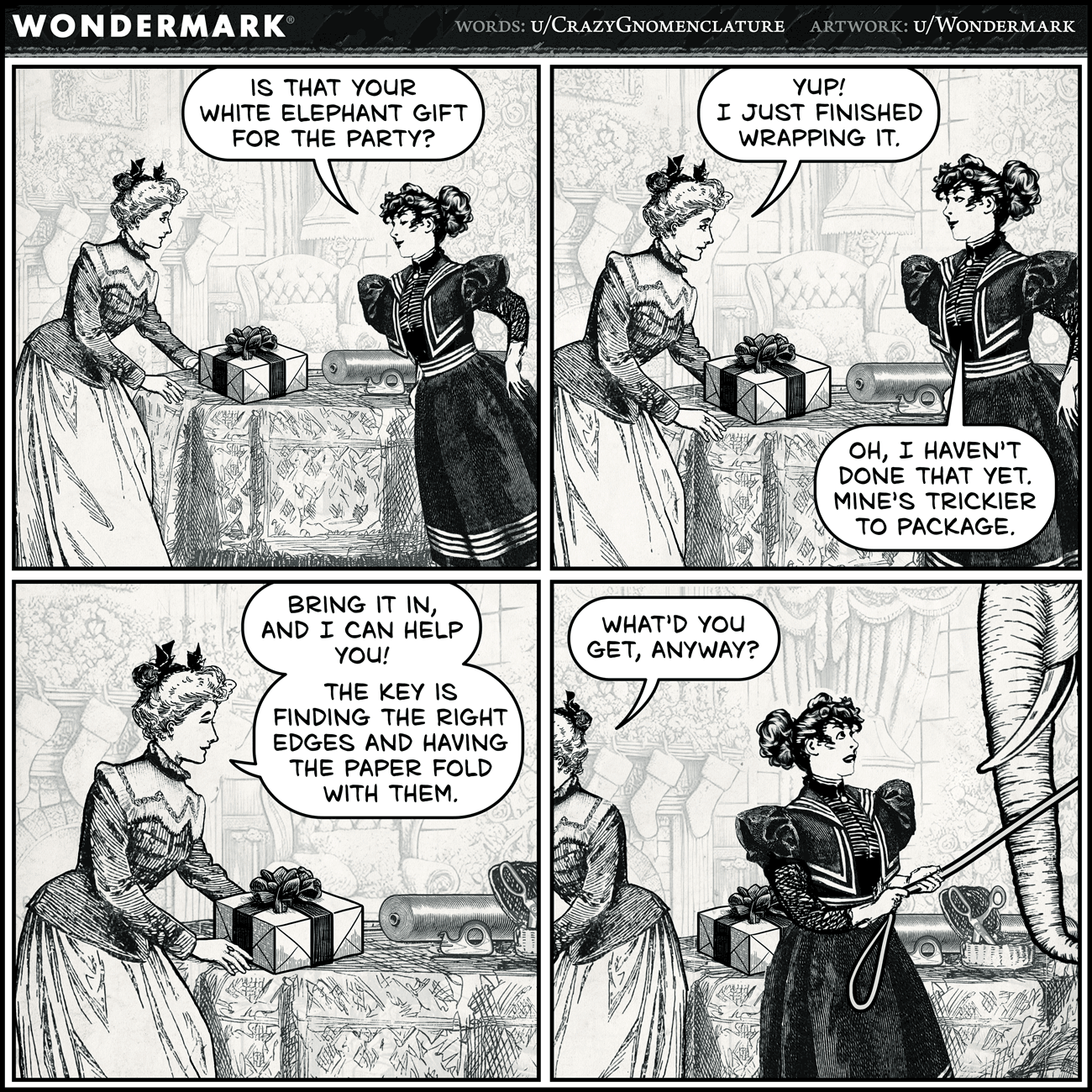 This comic was created as part of a “Secret Santa” comics exchange on Reddit. These characters are Tiff and Eve, and this strip was written by Fran Sundblad, the author of the comic Tiff 🏳️‍⚧️ & Eve, and rendered in Wondermark style by me.