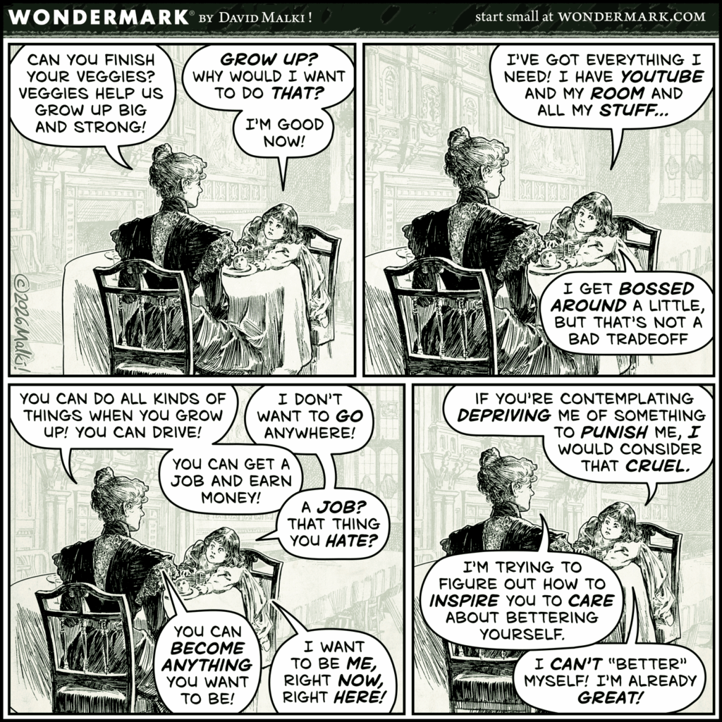 [ 💬 Comment thread on Discord ] #1583; Groan Up — April 4th, 2026 [ Tags: age, parenting, unruly children ] Permalink: https://wondermark.com/c/1583/ Buy a Print