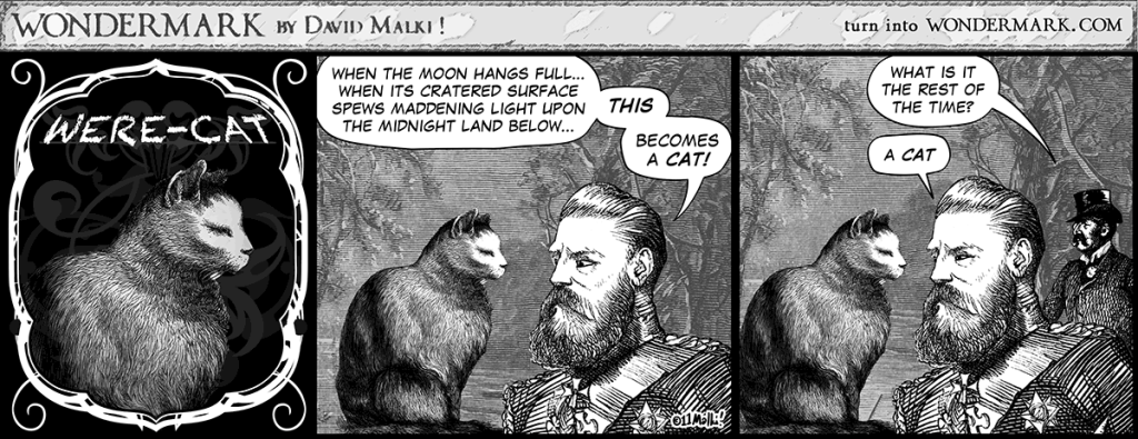 #696; The Chilling Case of Were-Cat — January 25th, 2011 [ Tags: animals, anomalies ] Permalink: https://wondermark.com/c/696/ Buy a Print
