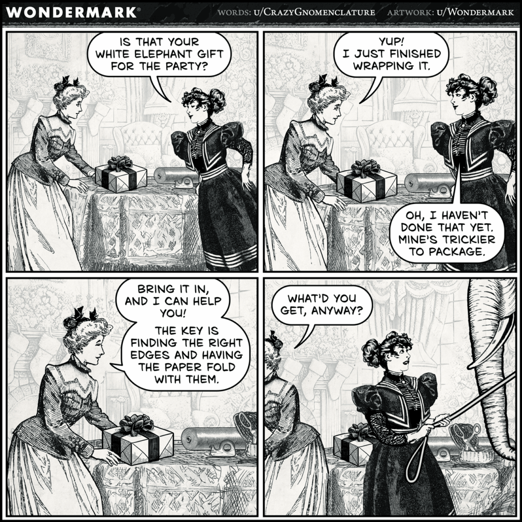 This comic was created as part of a “Secret Santa” comics exchange on Reddit. These characters are Tiff and Eve, and this strip was written by Fran Sundblad, the author of the comic Tiff 🏳️⚧️ & Eve, and rendered in Wondermark style by me.