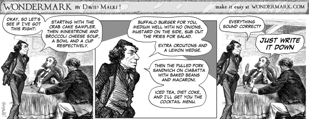 #514; In which the Waiter shows his Prowess — May 12th, 2009 [ Tags: annoyances, dining, narcissism ] Permalink: https://wondermark.com/c/514/ Buy a Print